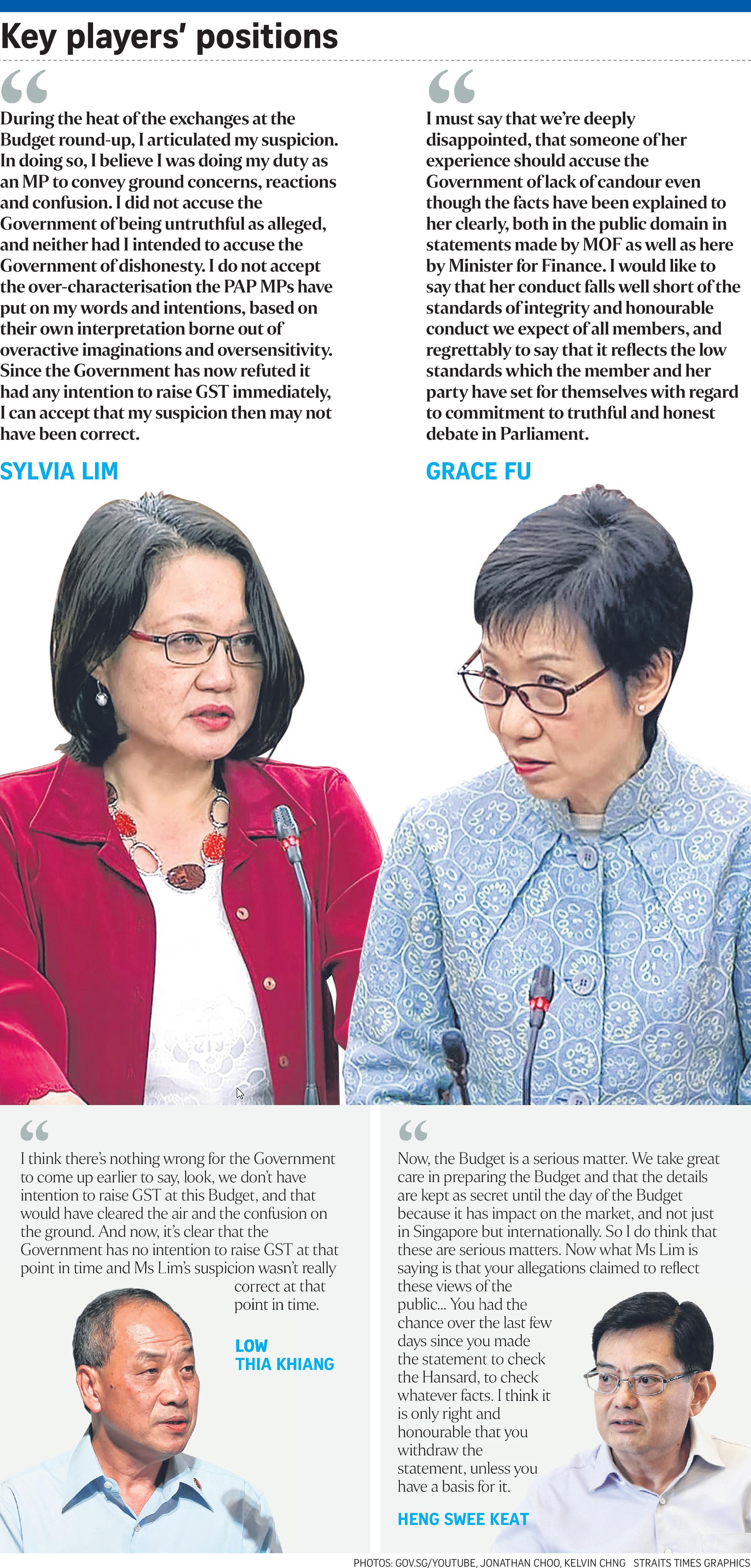 The exchange, which lasted 22 minutes, also saw Mr Heng weighing in. He said that the Government could not have made any earlier announcements on the GST hike, explaining: "We take great care in preparing the Budget and the details are kept secret until the day of the Budget, because it has an impact on the market, and not just in Singapore, but internationally."