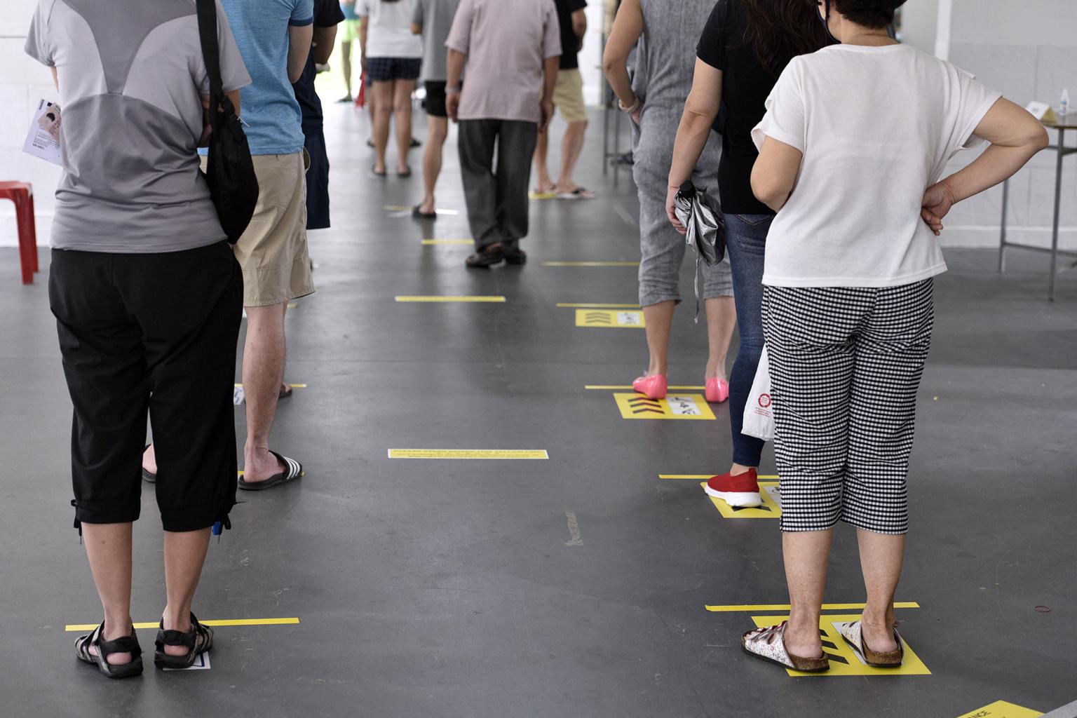 Voters practising social distancing as they wait in line to cast their votes for Mountbatten SMC at 54 Cassia Crescent on July 10, 2020.