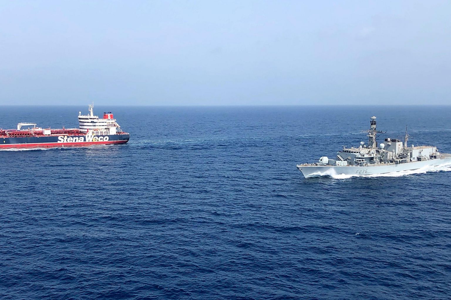 In a photo taken on July 25, 2019, the HMS Montrose (right) accompanies the vessel Stena in the Gulf. Several maritime incidents - including oil tankers being attacked and Iran seizing a British-flagged ship - have occurred in or near the Strait of Hormuz in recent months.