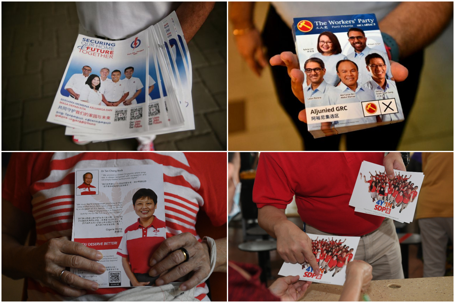 (Clockwise from top left) The fliers of the PAP, WP, SDP and PSP.