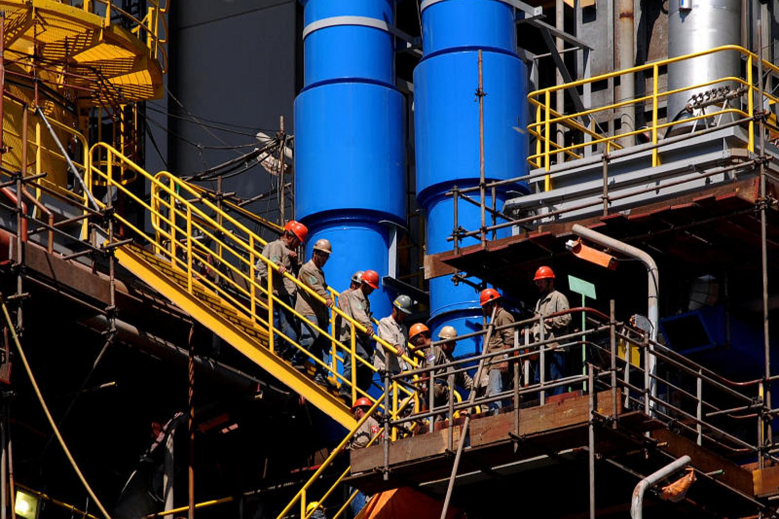 Rig workers at the Petroleo Brasileiro SA P-51 oil platform at the Keppel-Fels Shipyard in Angra dos Reis, Rio de Janeiro, on Aug 21, 2008.