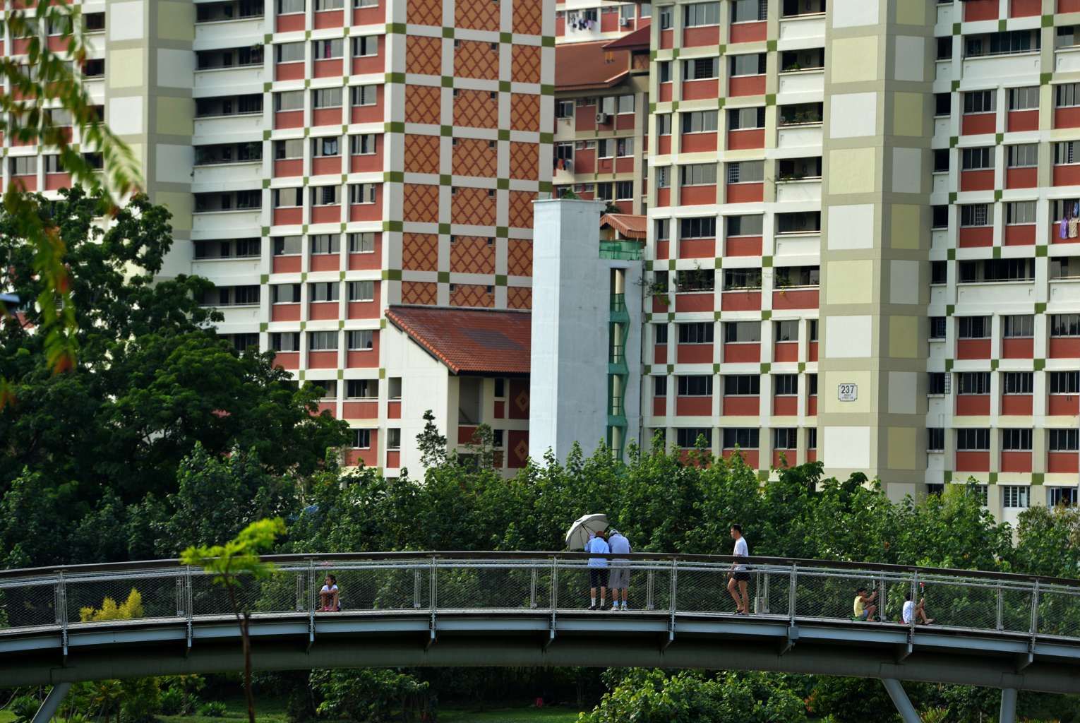 The young and elderly strolling along a bridge in Bishan Park, surrounded by HDB flats.
