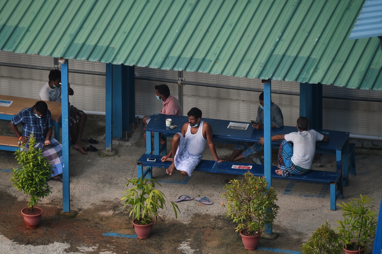 Foreign workers resting in an on-site dormitory on June 1, 2020.