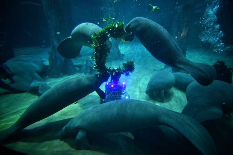 SINGAPORE - On Wednesday (July 26), the River Safari's animal icon Canola the manatee celebrated its third birthday. The manatee was presented with a 2m-tall cake made out of cabbage, carrots and sweet potato leaves, and celebrated its birthday alongside 60 invited guests.