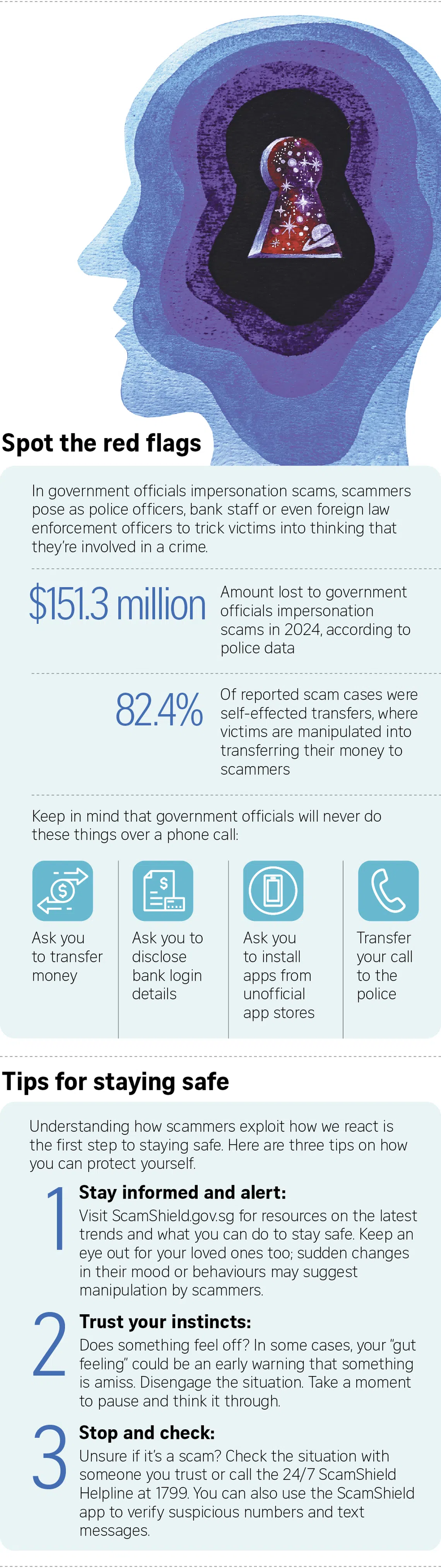 “Scammers prey on our trust and tendency to comply with authority figures,” says Mr Jeffrey Chin, deputy director of SPF’s Scam Public Education Office. “They undermine our ability to process the situation by evoking fear and a sense of urgency to resolve the situation.”
