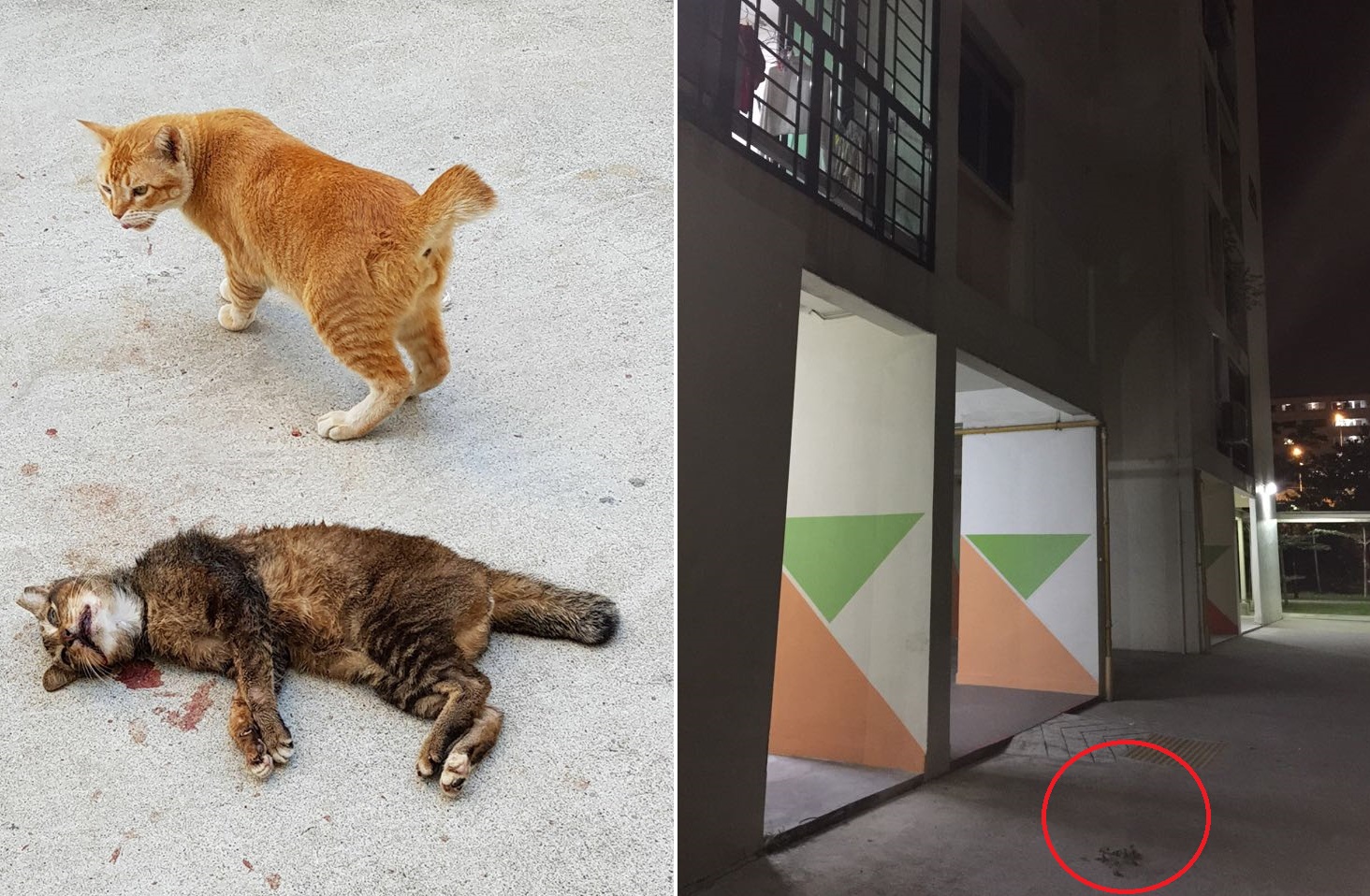 A ginger cat named Boy Boy looks at its dead friend, named Girl Girl. (Right) Blood stains where the cat was found.