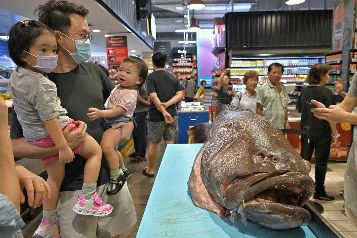 Two young girls carried by their father in front of the 100kg giant grouper at FairPrice Xtra AMK Hub on June 17.