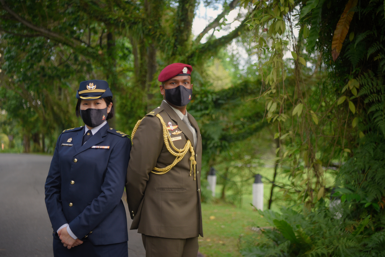 (From left) LTC Rachel Lim of the Republic of Singapore Air Force and Maj NS Dr Ramesh Wijaya of the Singapore Armed Forces Commando Formation at the Istana on Feb 14, 2022.