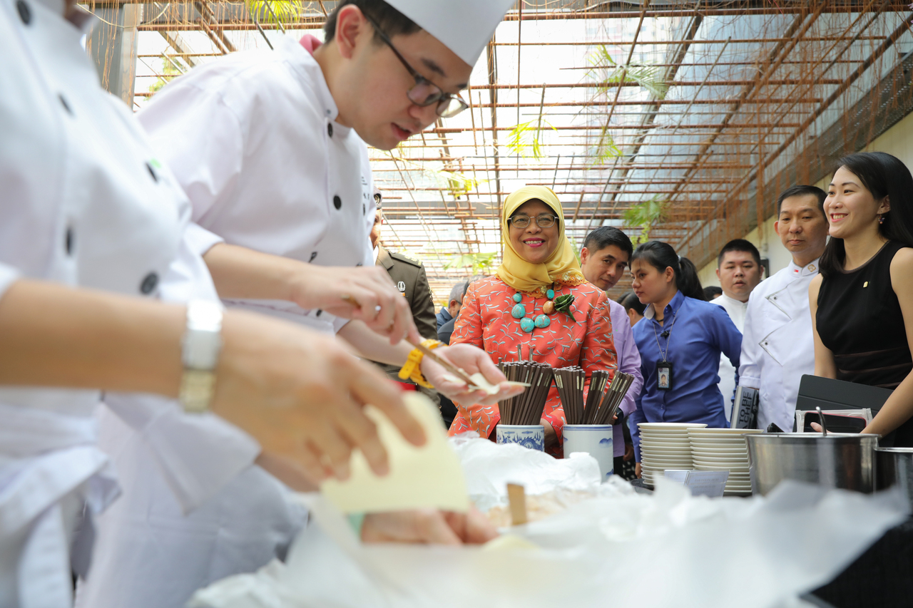 President Halimah on a tour of Samsui Kitchen.