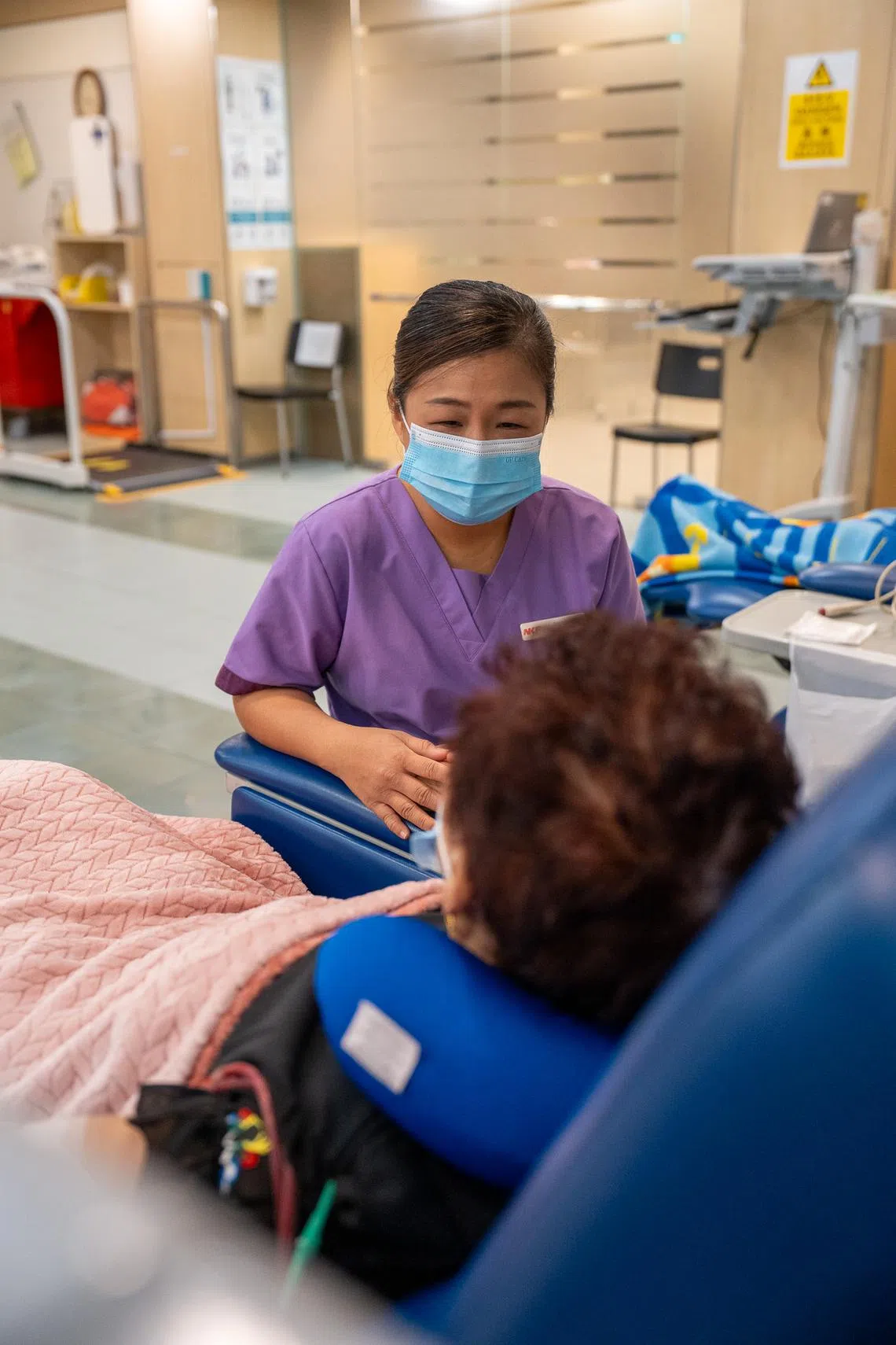 Nurse manager Tan Bee Lei treating a dialysis patient.
