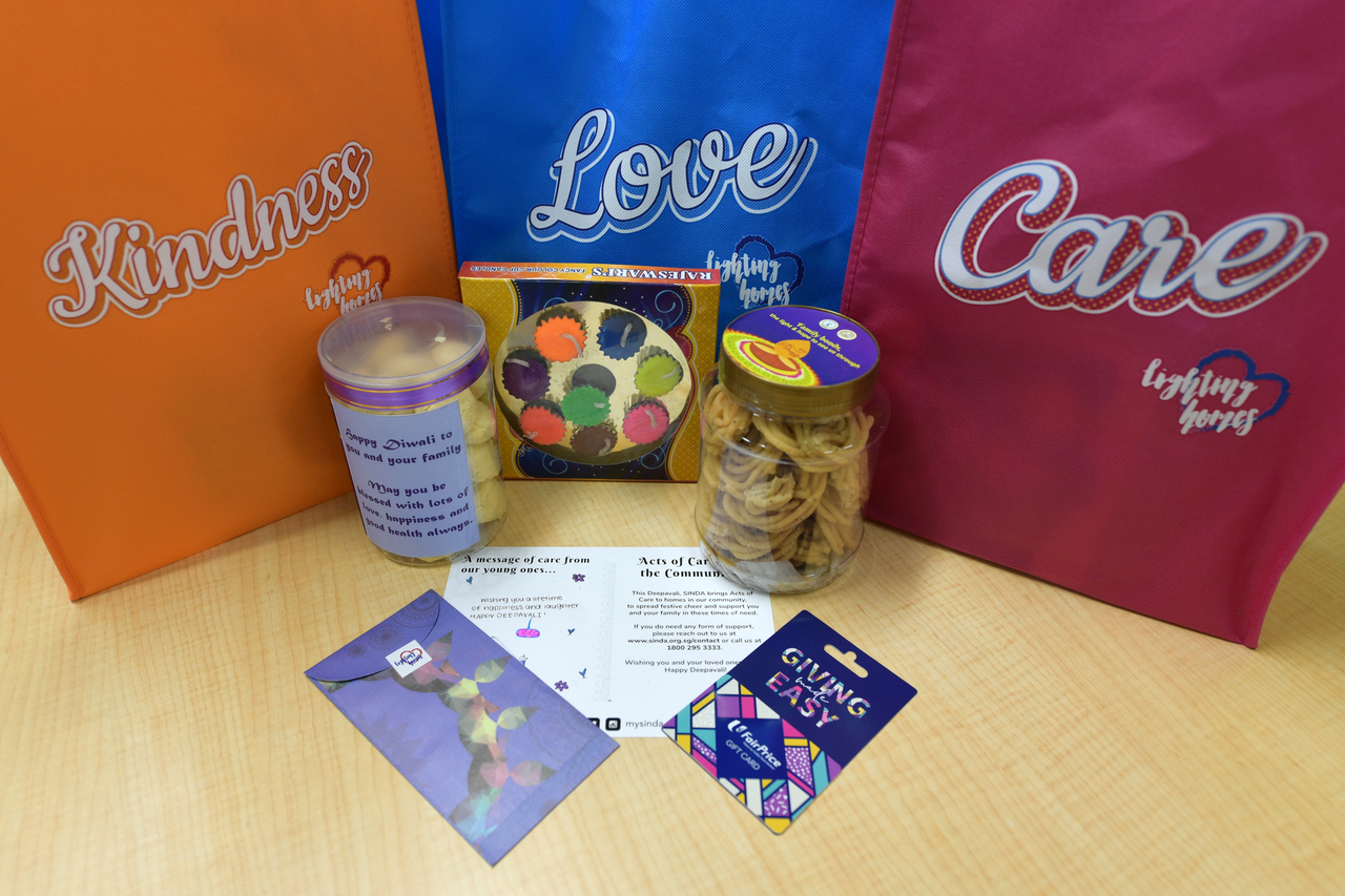 The aim this year is to reach out to 1,500 families. Each gift pack includes $120 cash packets, Deepavali candles, Suji cookies made by volunteers, NTUC vouchers contributed by the Singapore-Indian Development Association (Sinda), as well as handwritten notes by students from the Sinda learning centres.