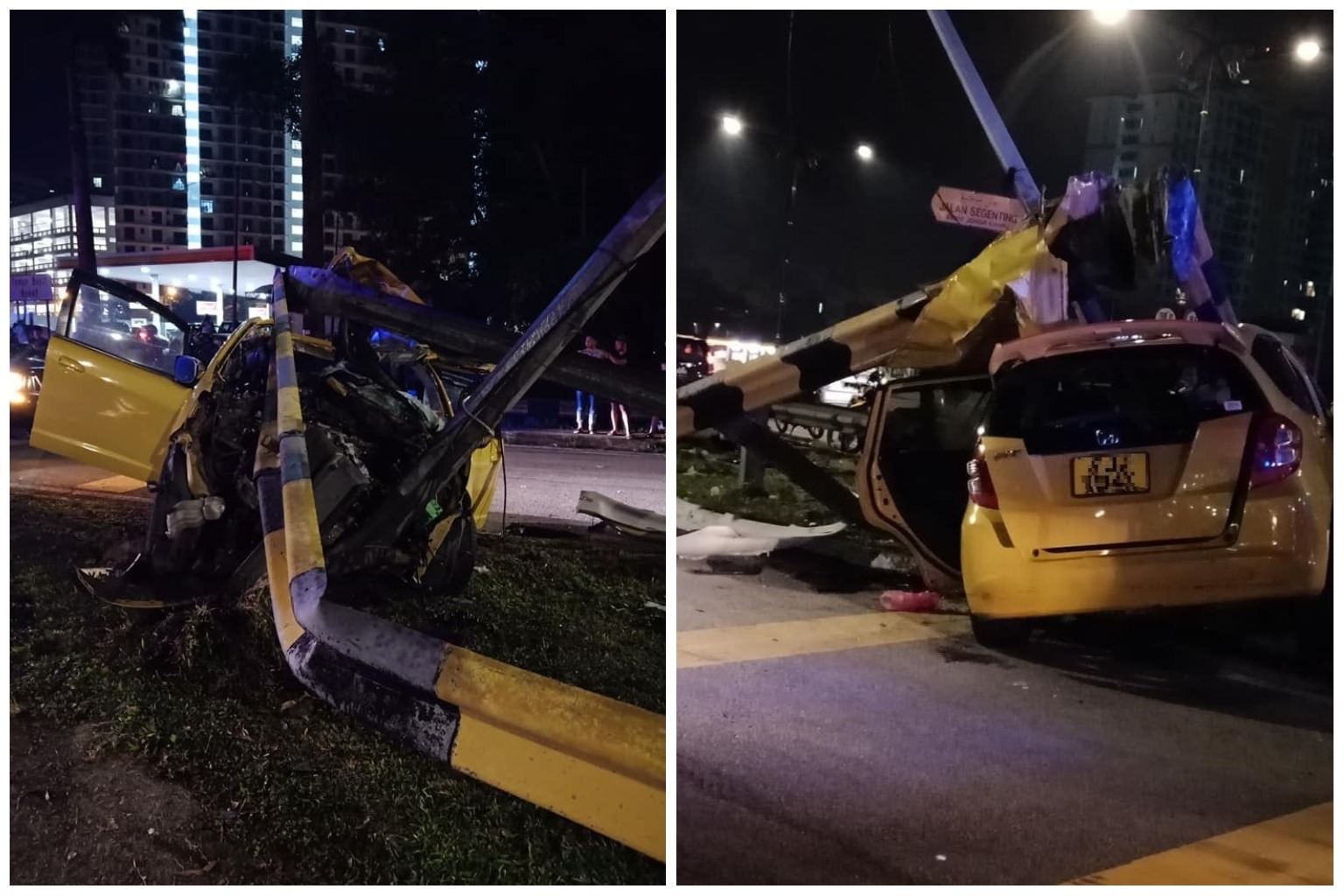 Photos of the mangled yellow Honda have been shared on Facebook since Saturday, and show the vehicle by the side of the road, near a road divider, lamp post and road sign.
