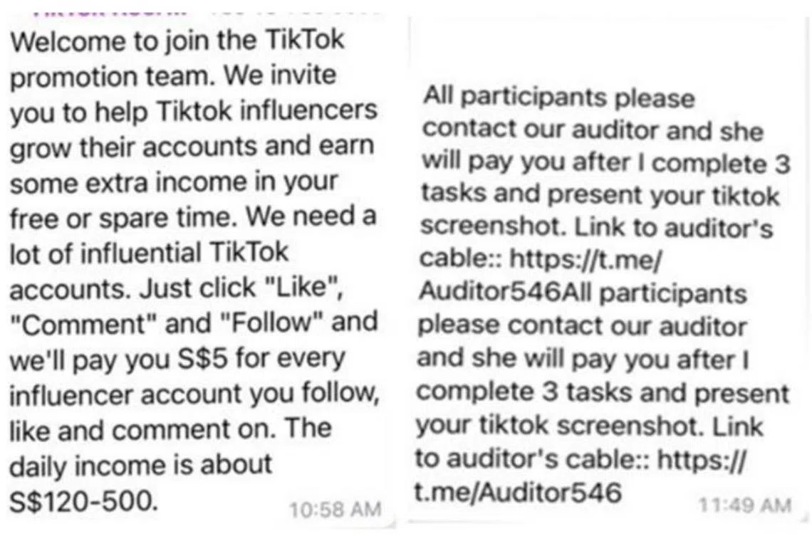 “In some cases, scammers may also claim to represent TikTok or online communications and marketing companies when they approached victims with job offers.”