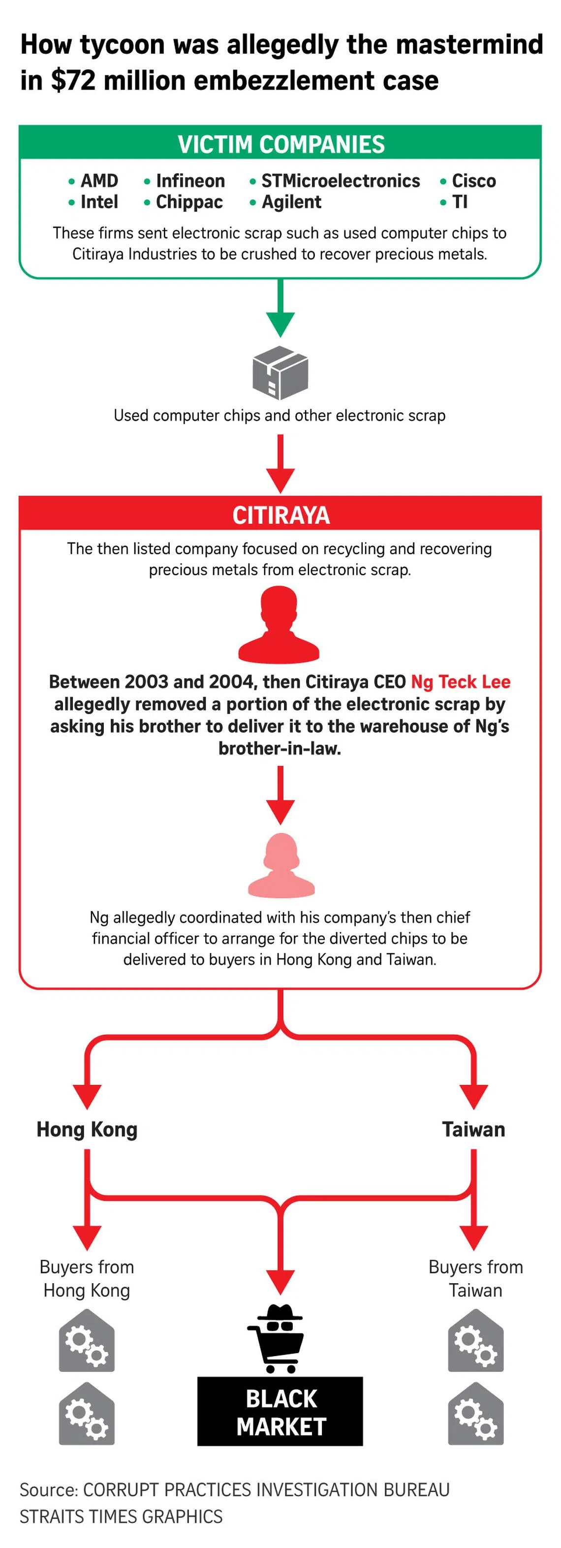In a CPIB officer’s affidavit in June 2008, it was revealed that Ng sold the scrap to syndicates in Taiwan and Hong Kong, before it was repackaged and sold as new products.