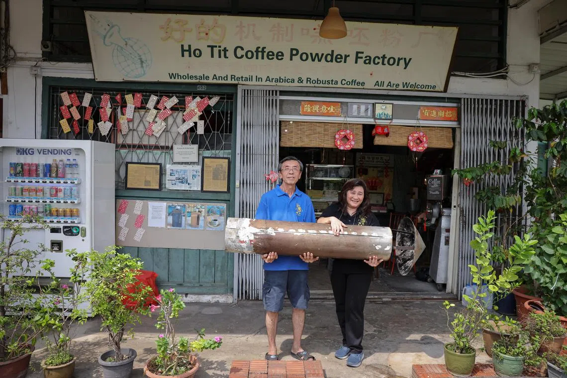 Mr Dominic Chua and Ms Cynthia Aw in front of their shop with the tip of a chimney taken from their almost 4m-tall coffee roasting machine.