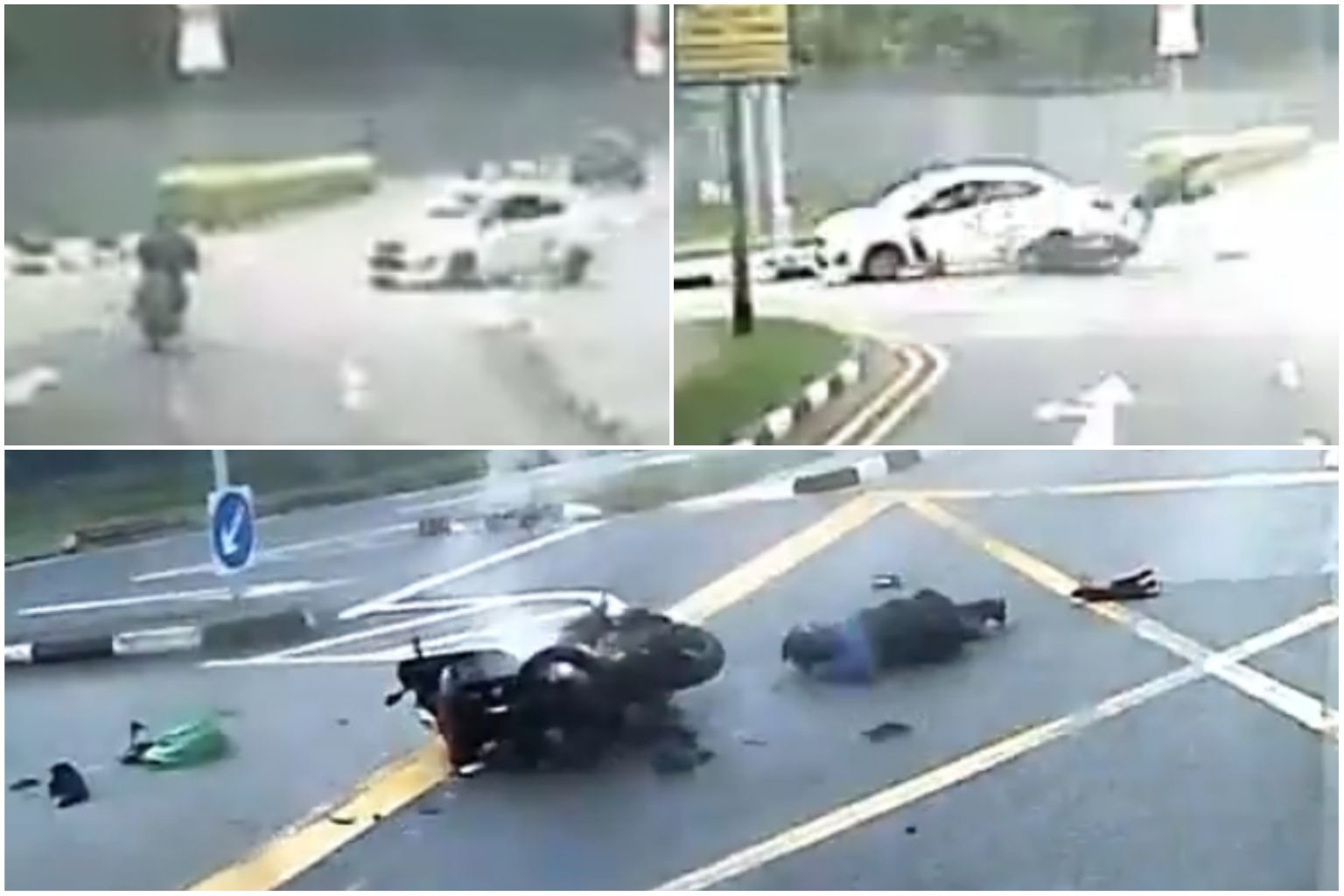 A white car turns right and cuts into the path of a motorcyclist, who is sent flying by the impact of the crash.