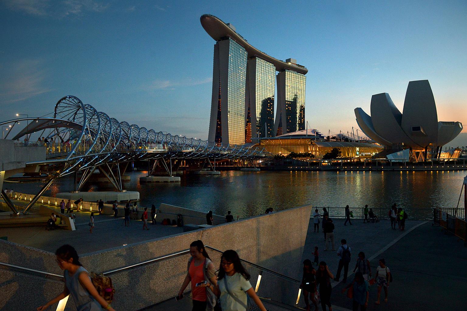 Tourists walking along the path to the Helix Bridge, with the Marina Bay Sands and ArtScience Museum in the background at dusk.