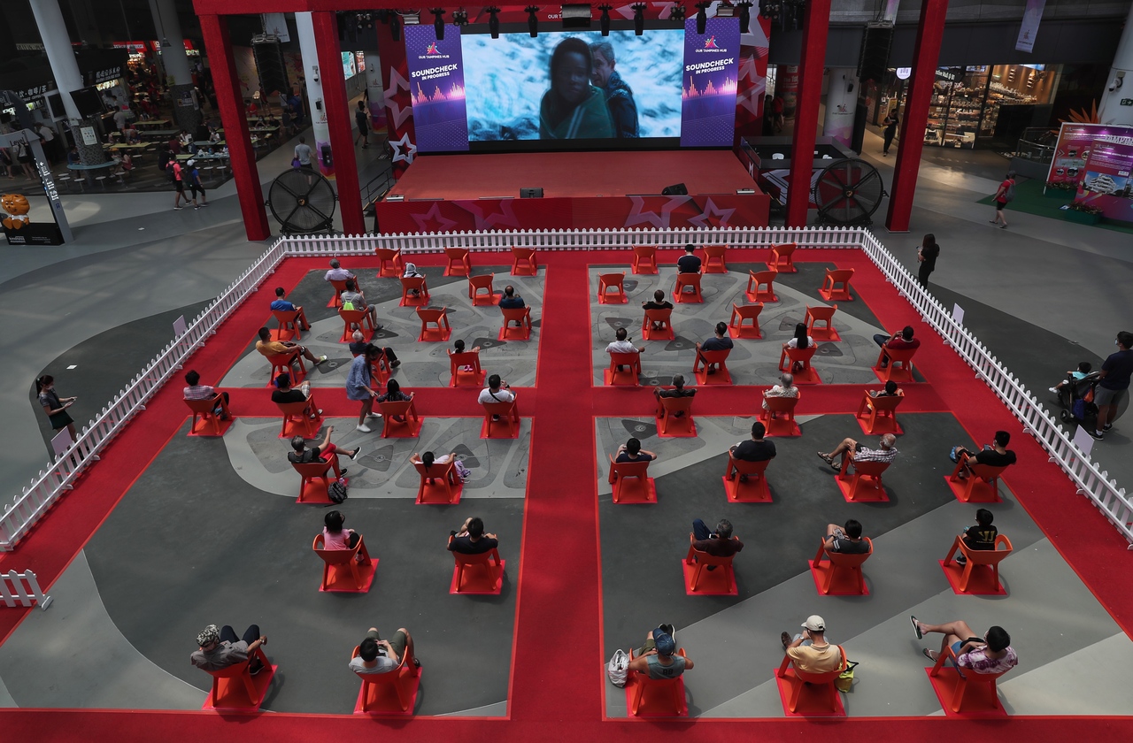 People attend a free movie screening at Our Tampines Hub in September 2020 with safe-distancing in practice.