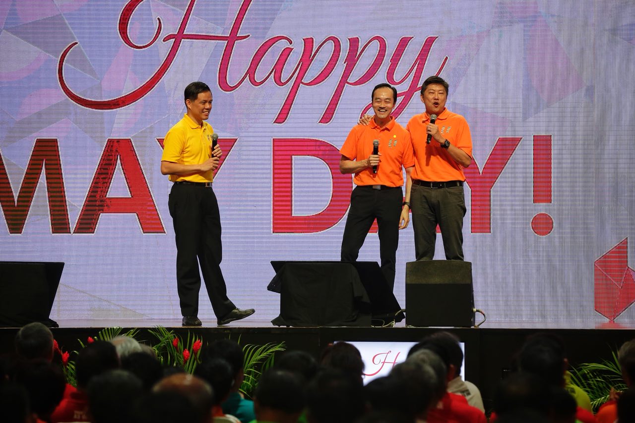 Labour chief Chan Chun Sing (left) with deputy secretary-generals Koh Poh Koon (centre) and Ng Chee Meng on stage during the May Day Rally at D’Marquee in Downtown East on May 1, 2018.