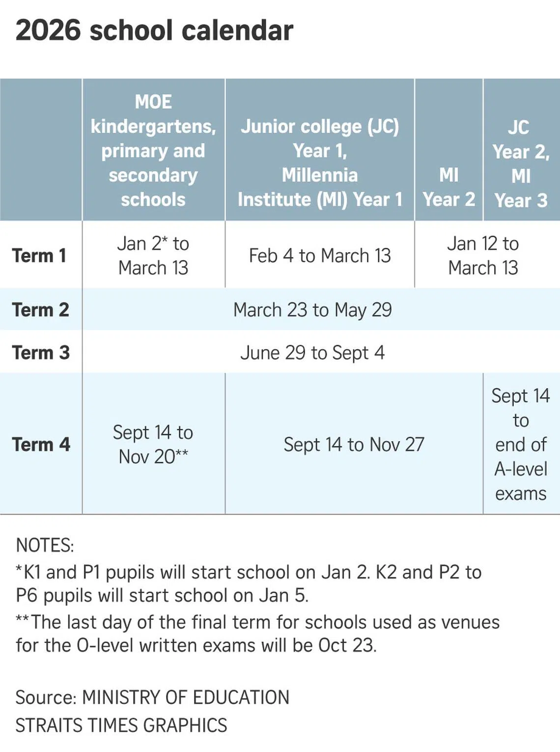 The school terms and holidays for 2026 are listed on MOE’s website at