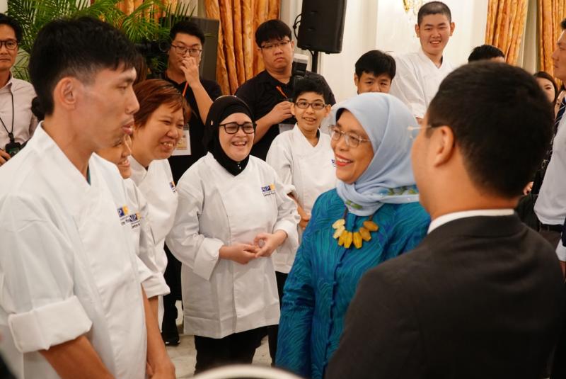 President Halimah Yacob (in blue) and Minister for Social and Family Development Desmond Lee (foreground, in black) mingle with Community Chest beneficiaries at the Community Chest Awards at the Istana on Oct 9, 2019.