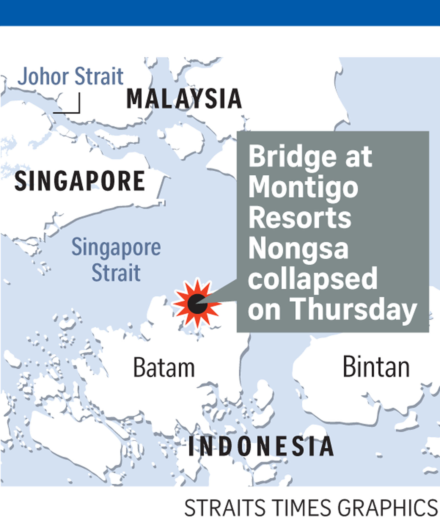 The group of about 30 heard a cracking sound, before most of them fell about 3m into shallow waters at the Montigo Resorts Nongsa.
