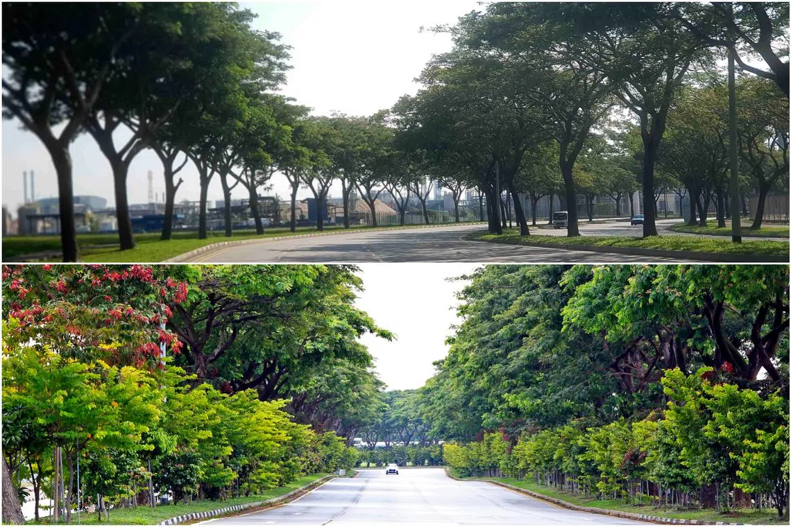 Trees planted in a multi-tiered manner along Meranti Avenue on Jurong Island.