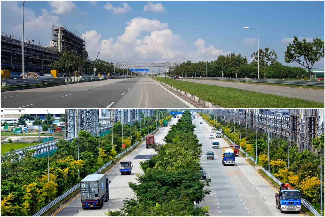 Jurong Island Highway in 2018 (top) and in 2022 (bottom).