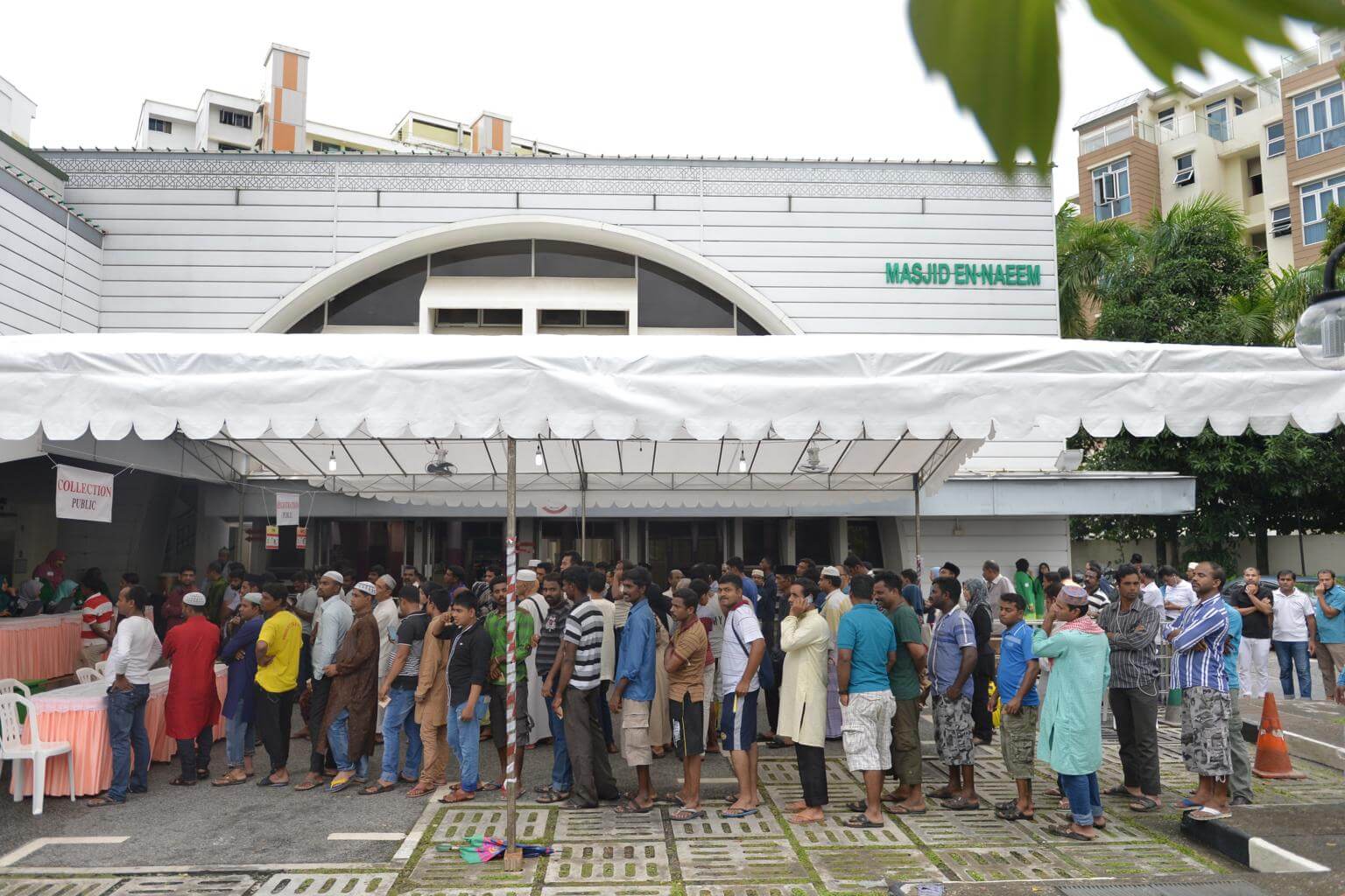 Worshipers standing in line outside En-Naeem Mosque after registering to collect korban meat on Sept 12, 2016.