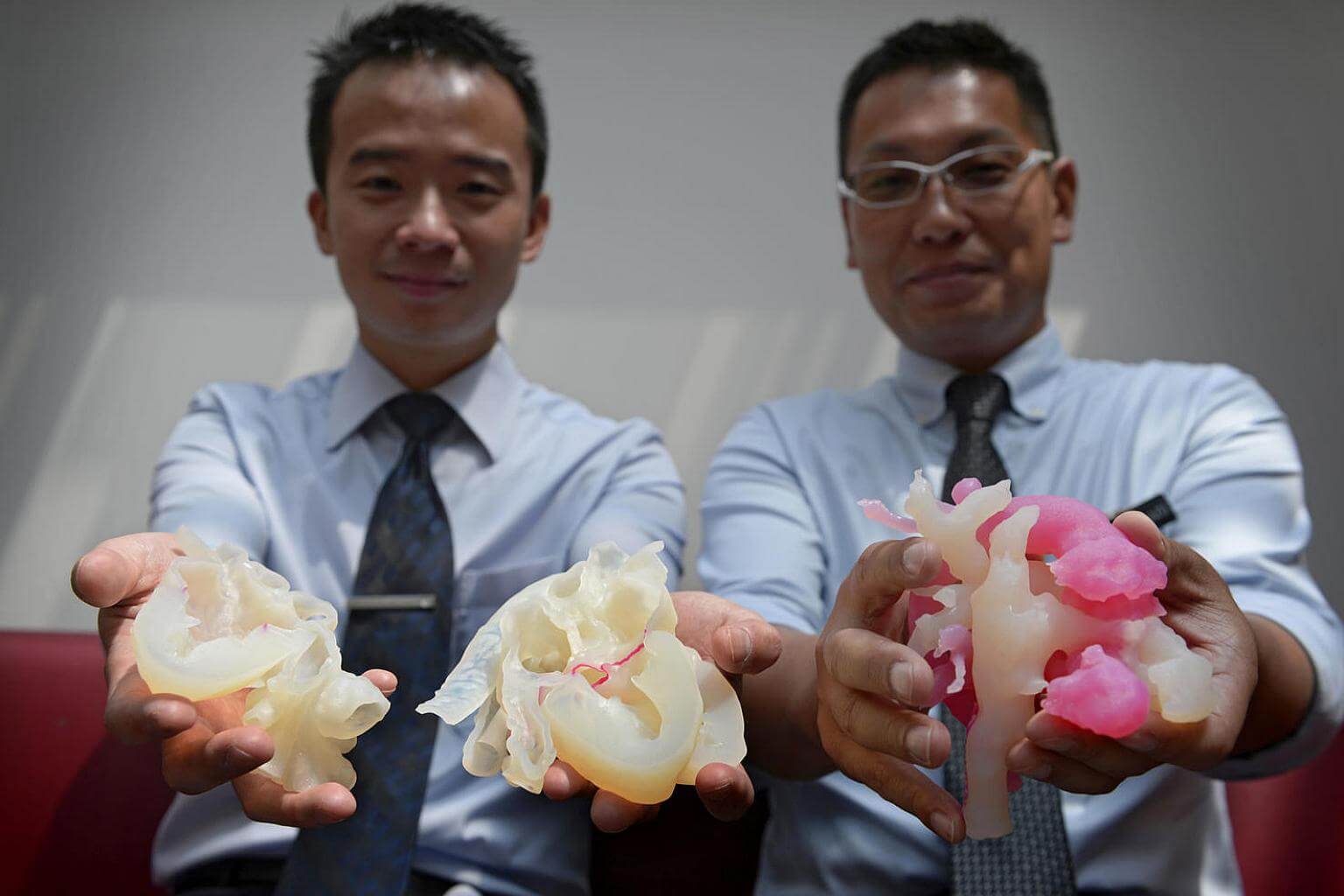 KKH's Cardiology Service Consultant Dr Chen Ching Kit (left) and Cardiothoracic Surgery Service Consultant Dr Nakao Masakazu holding 3D printed heart models.