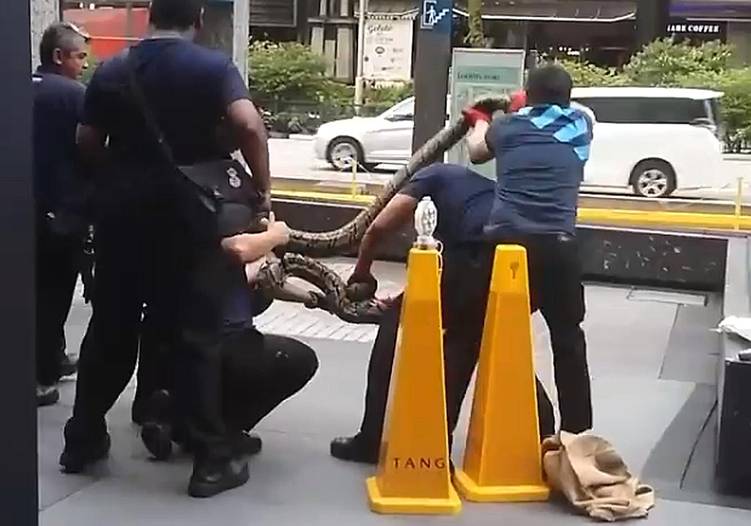 A 3m-long snake struggling as several men attempt to capture it. The python outside Tang Plaza was eventually removed and handed over to Wildlife Reserves Singapore. PHOTO: FACEBOOK/RABBIKHAN KHAN