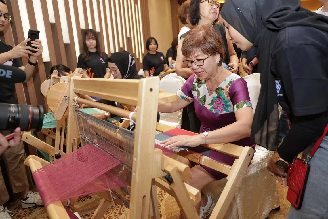 Mayor of Central Singapore District Denise Phua trying her hand at weaving on a loom during the launch of a new initiative, Y+, on June 7.