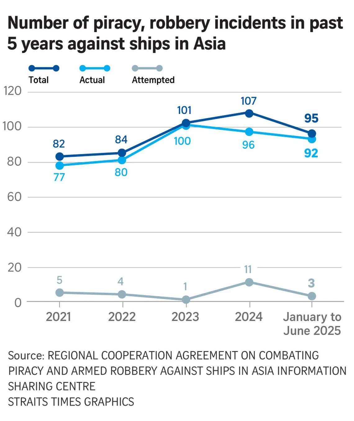 There were 80 such incidents reported between January and June 2025 to the anti-piracy group, ReCAAP Information Sharing Centre (ISC).