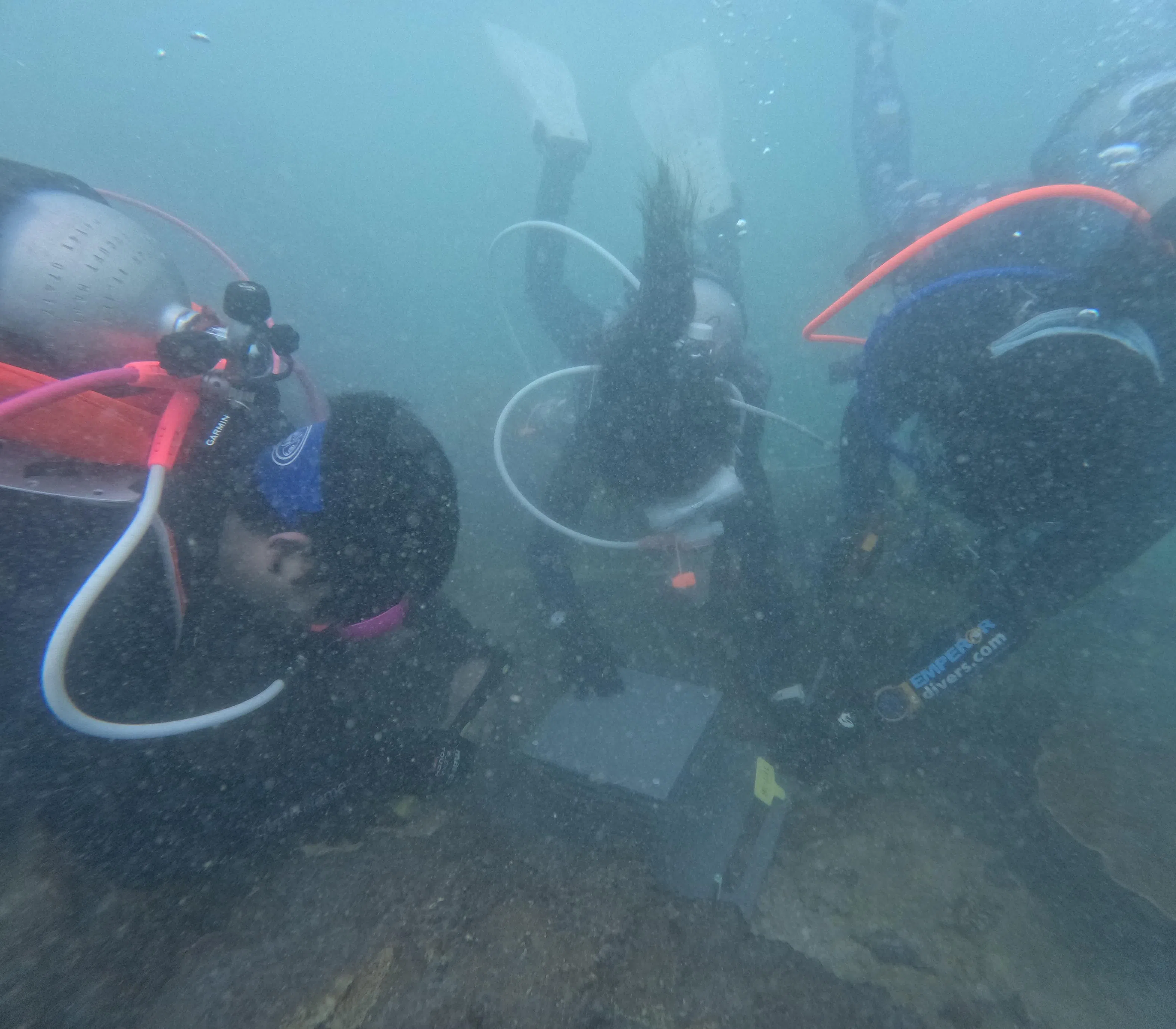 Volunteer divers helping to install an Autonomous Reef Monitoring Structure on Oct 9 in the waters off Pulau Semakau.
