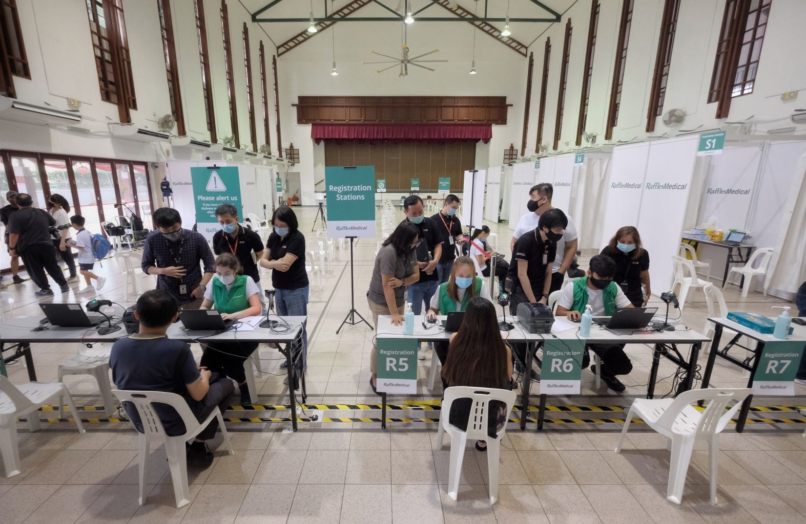 Volunteers wait to get the Covid-19 vaccine as they participate in a trial run at the vaccination centre in Tanjong Pagar Community Club, on Jan 26, 2021.