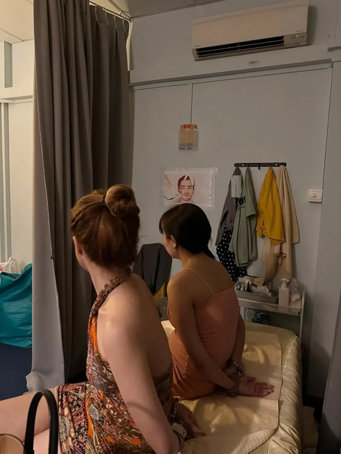 The women covered their faces with their hands while standing in the dimly lit room as police officers in uniform asked for their mobile phones and identification documents. After a 20-minute check, those who were not subject to further investigations were told to go straight home.