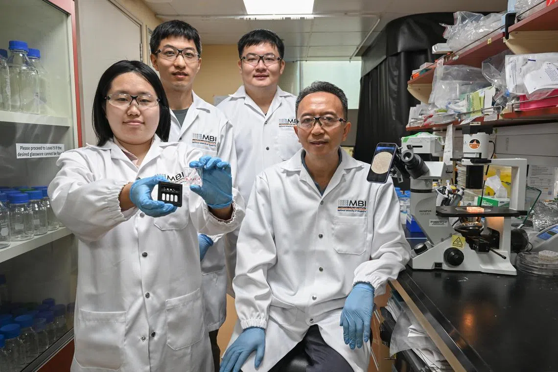 Professor Yan Jie (front row, right) and his team, (from left) Ms Jiang Yanqige, Dr Zhao Xiaodan and Dr Zhou Yu, are developing easy-to-use diagnostic tools for disease diagnosis and monitoring.