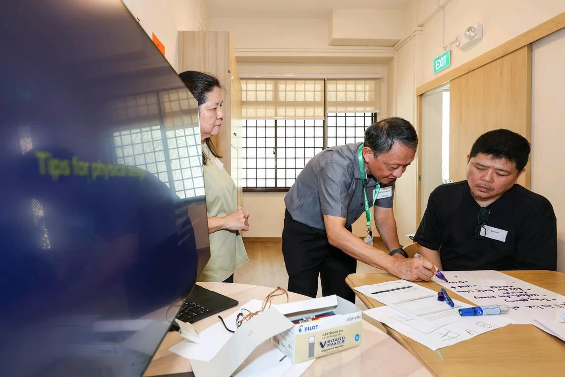 (From left) Caregivers Yvonne Tai and Bob Lee being guided by Autism Resource Centre (Singapore) principal autism consultant Lam Chee Meng on how to better care for their children with autism at Flourish for Life Centre on Sept 6.