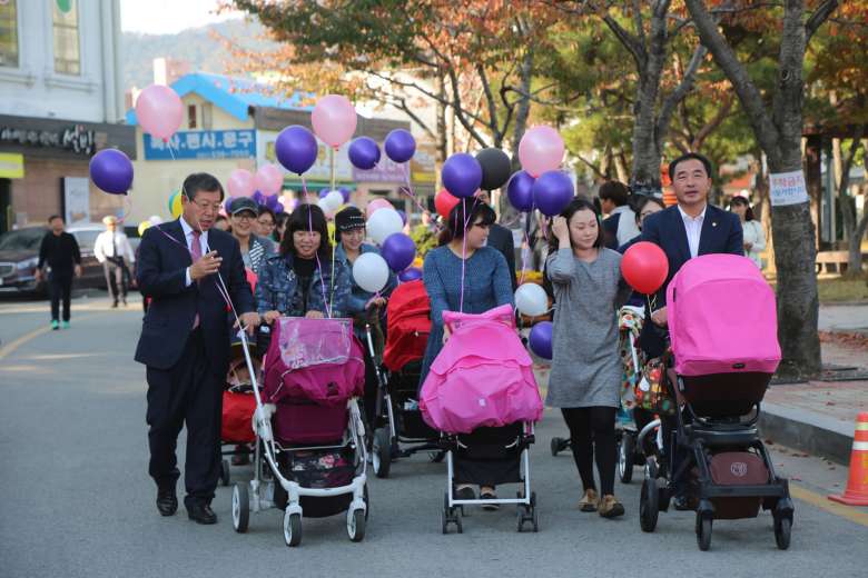 Haenam county mayor Park Cheol Hwan (in suit) with a group of 300 mothers and their babies in a march through Haenam's main street last November to celebrate the county’s high fertility rate of 2.4.