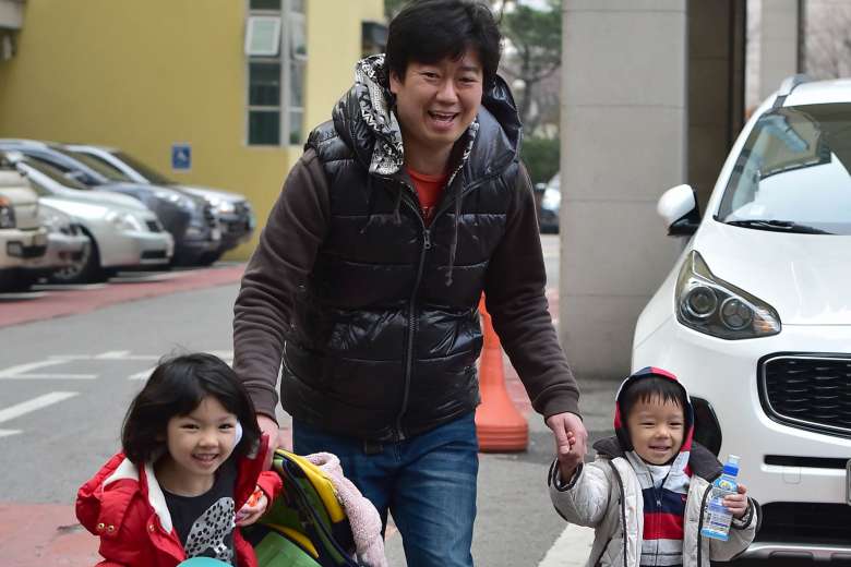 South Korean father Kim Jin Sung taking his daughter Na Eun and son Won Woo home from a childcare centre in Seoul. Fathers in South Korea get five days of paternity leave, but less than 2 per cent take it up. Those who are on paternity leave have to forgo their salary.