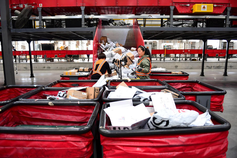 Workers sort parcels at an SF Express distribution centre ahead of the Singles' Day online shopping festival, in Shenyang, China on Oct 24.