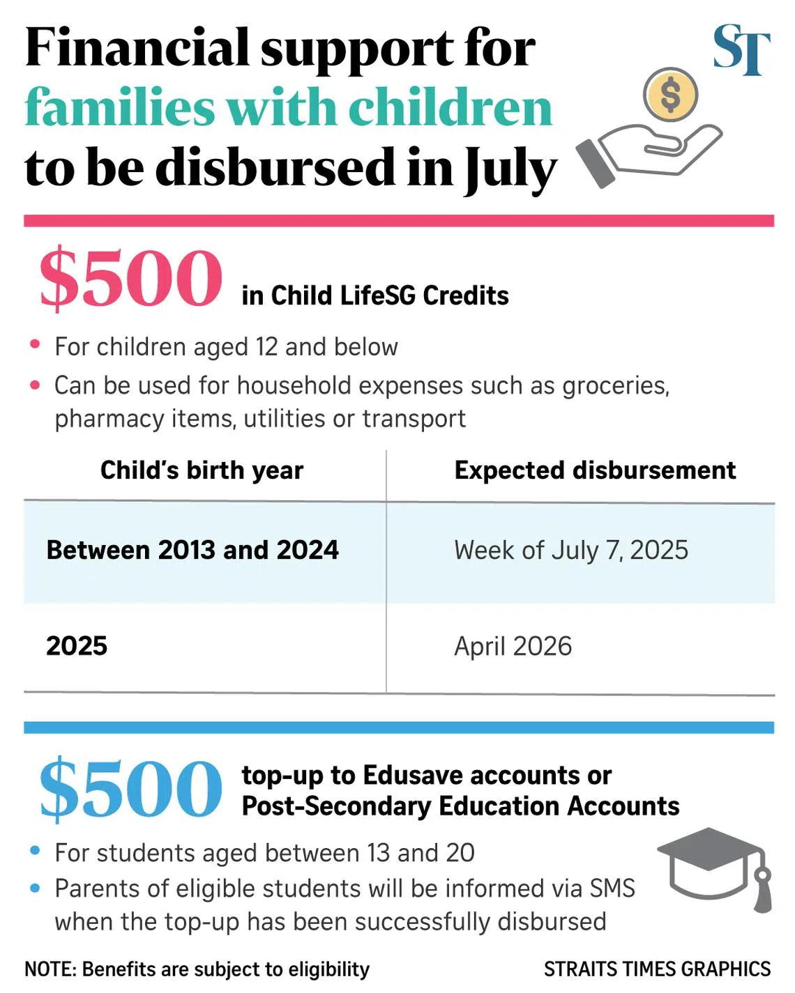 These are part of the suite of household support measures announced at Budget 2025 in February to help families manage their child-raising costs, said the Ministry of Education (MOE) and the Ministry of Social and Family Development (MSF) in a joint statement on July 3.