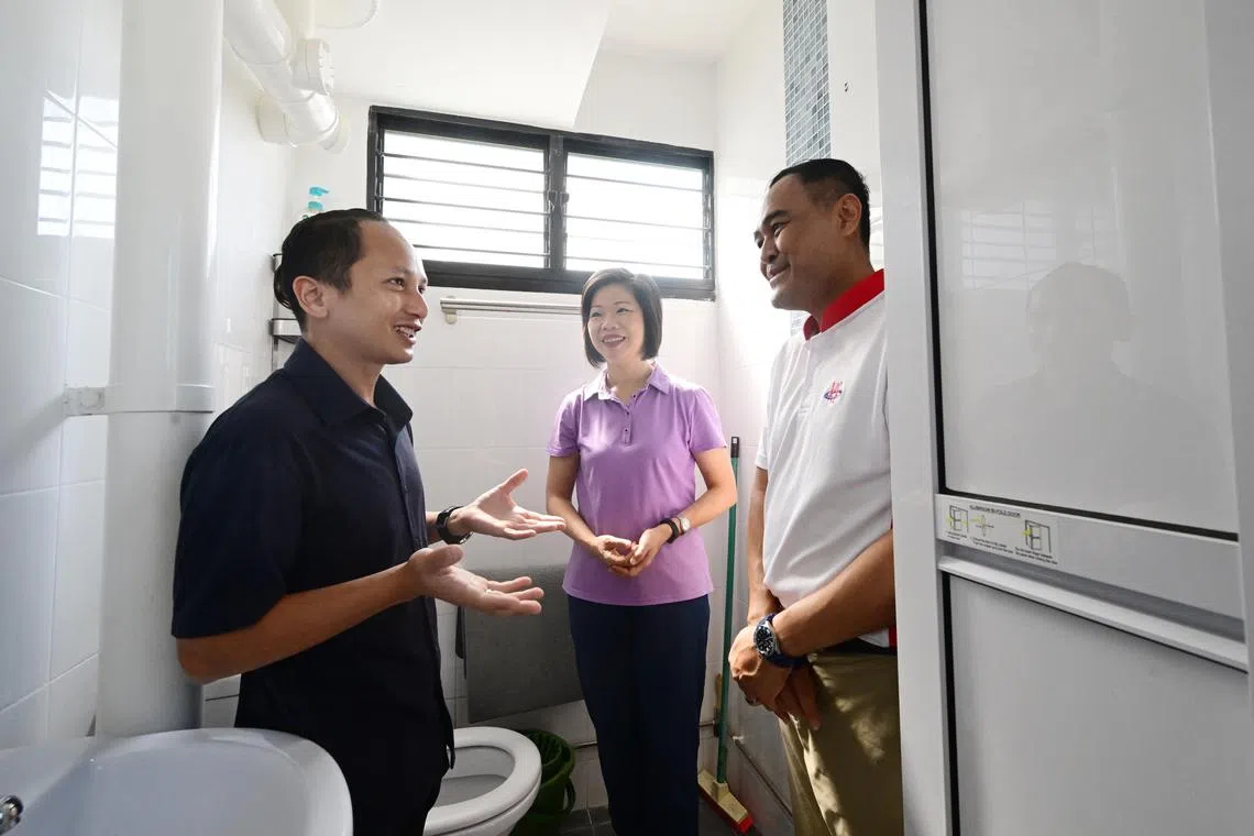 Engineer Muhammad Nabilul Fikri Mohamed Hassan (left) showing Senior Minister of State for National Development Sim Ann and grassroots adviser Shamsul Kamar Mohamed Razali the improvements to his bathroom.