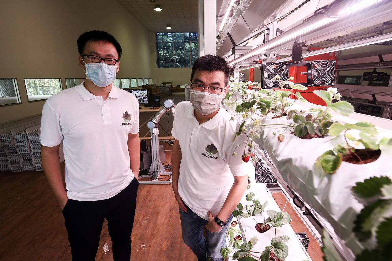 Co-founders, Dr Bao Shengjie (left) and Mr Xu Tao, of home-grown start-up Singrow developed an indoor farm for hydroponic strawberry production.