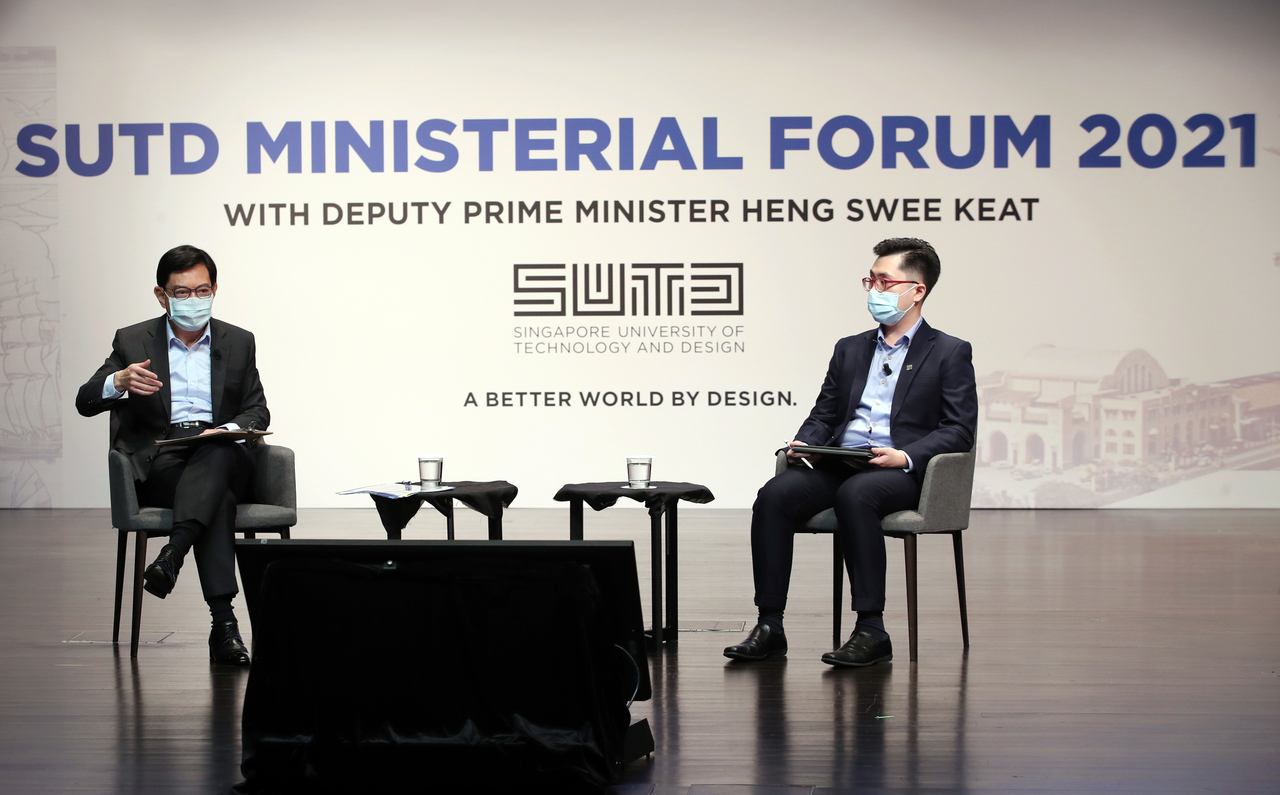 DPM Heng Swee Keat participating in a dialogue moderated by final-year SUTD student Ng Jing Da at SUTD on April 16, 2021.
