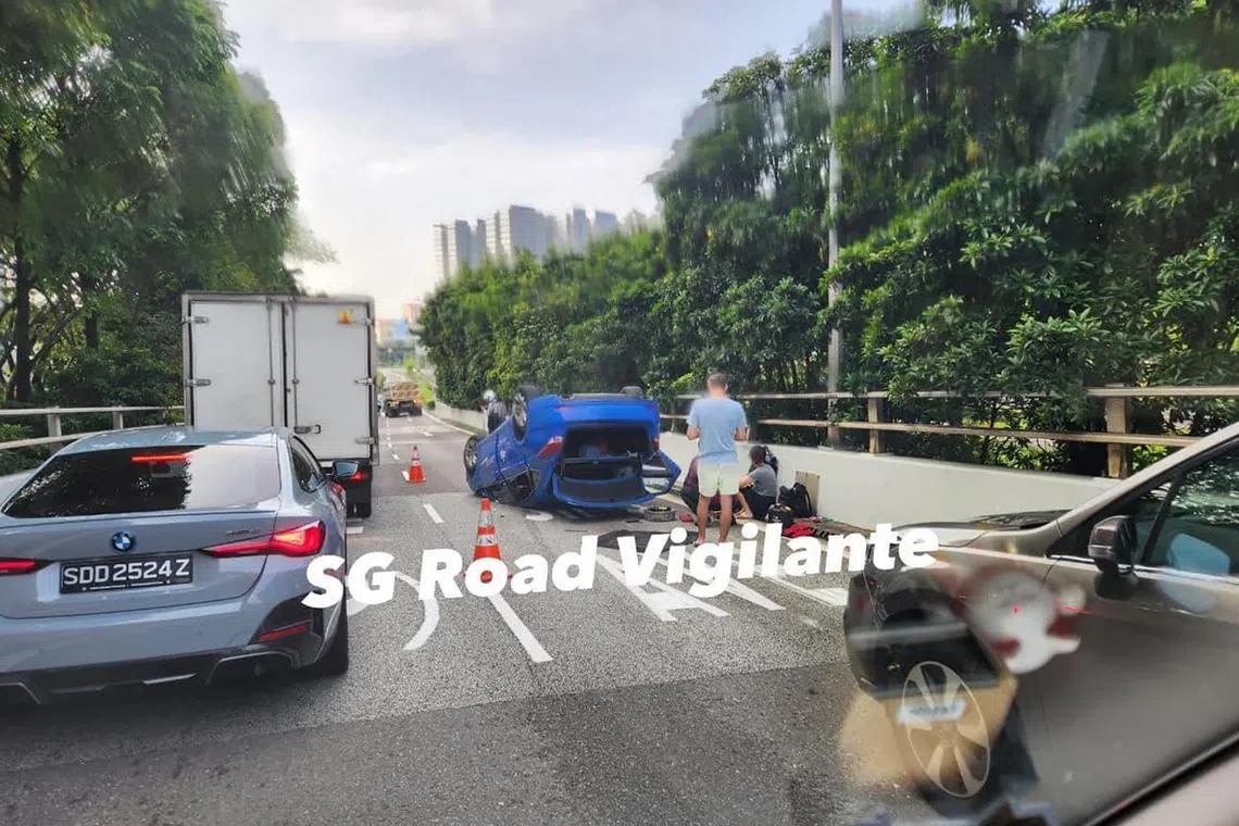 A photo of the aftermath of the incident on Facebook page SGRV Admin shows a ComfortDelGro taxi that turned turtle on the right lane of a two-lane slip road.