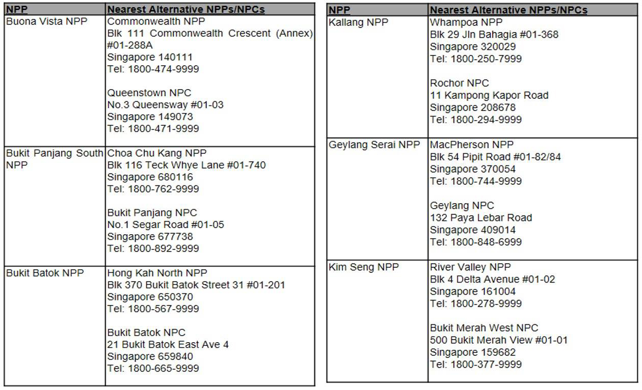 The six affected posts are: Kallang Neighbourhood Police Post, Geylang Serai Neighbourhood Police Post, Kim Seng Neighbourhood Police Post, Buona Vista Neighbourhood Police Post, Bukit Batok Neighbourhood Police Post and Bukit Panjang South Neighbourhood Police Post.