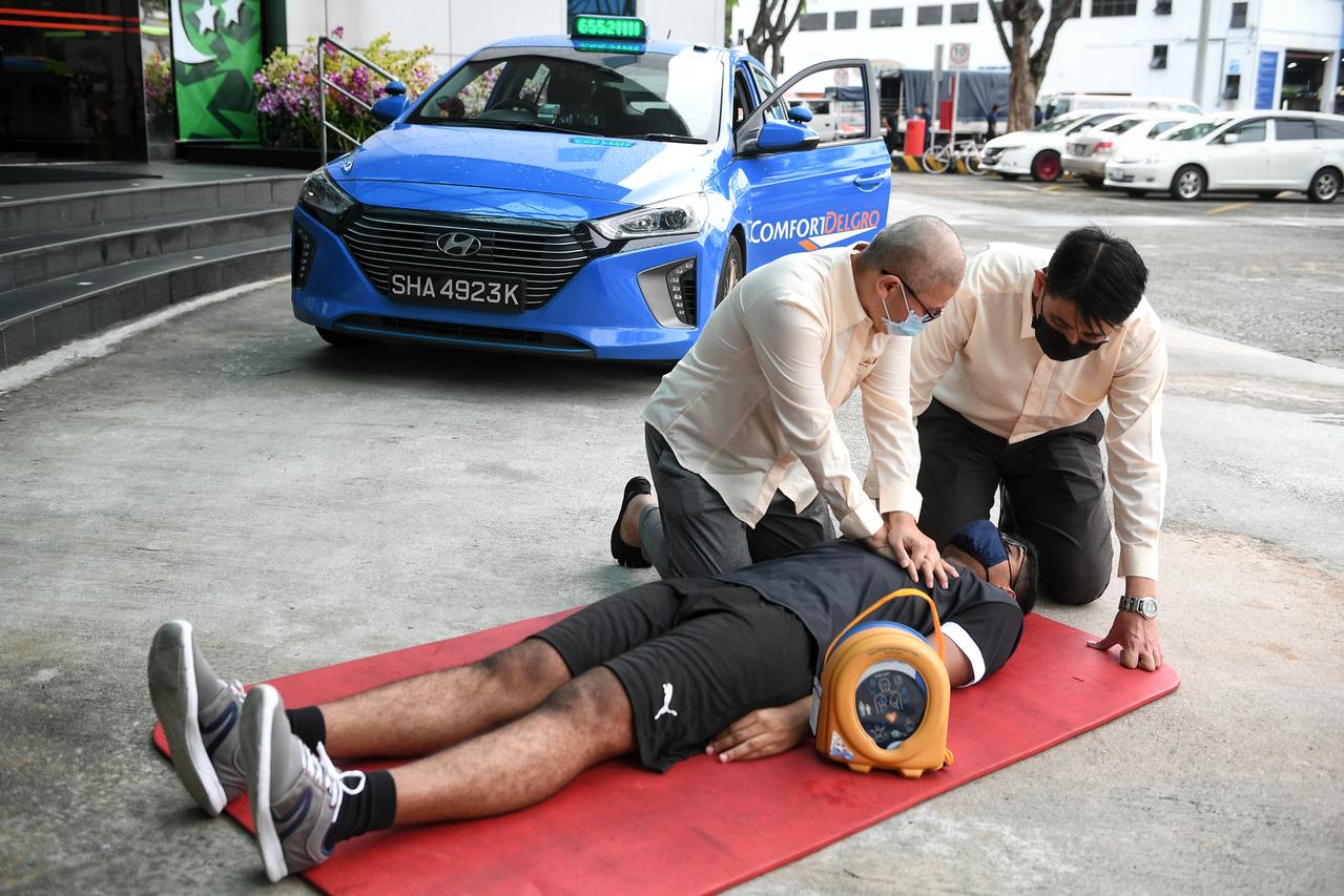 The 60 ComfortDelGro drivers for the vehicles have been trained in the "triangle of life" - first aid, cardiopulmonary resuscitation and AED use, and firefighting - and will be alerted to related emergencies within 1.5km of their vehicles via an app.