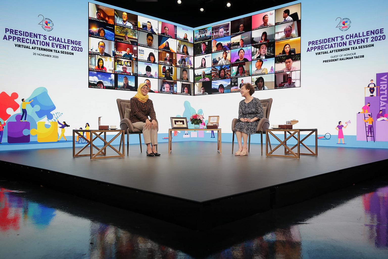 President Halimah Yacob (left) and host Susan Ng at the President’s Challenge Appreciation Event on Nov 20, 2020.