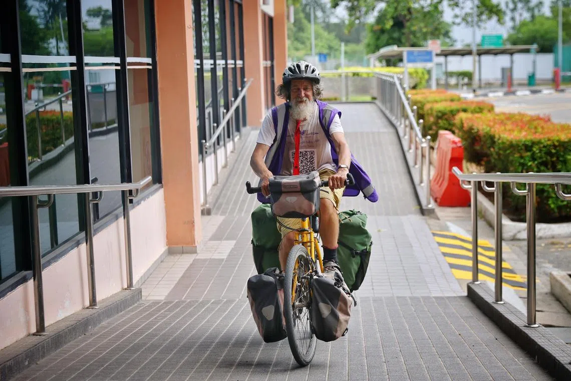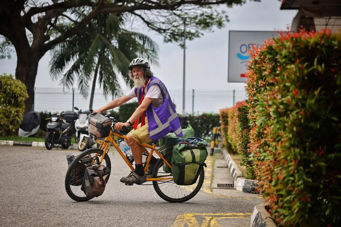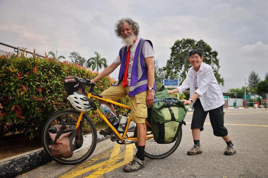 The 65-year-old retired Australian scientist arrived in Singapore on the 129th day of his journey. His wife Cora, 56, flew in from Australia earlier and greeted him at the arrival hall. Both are avid cyclists who love the outdoors.